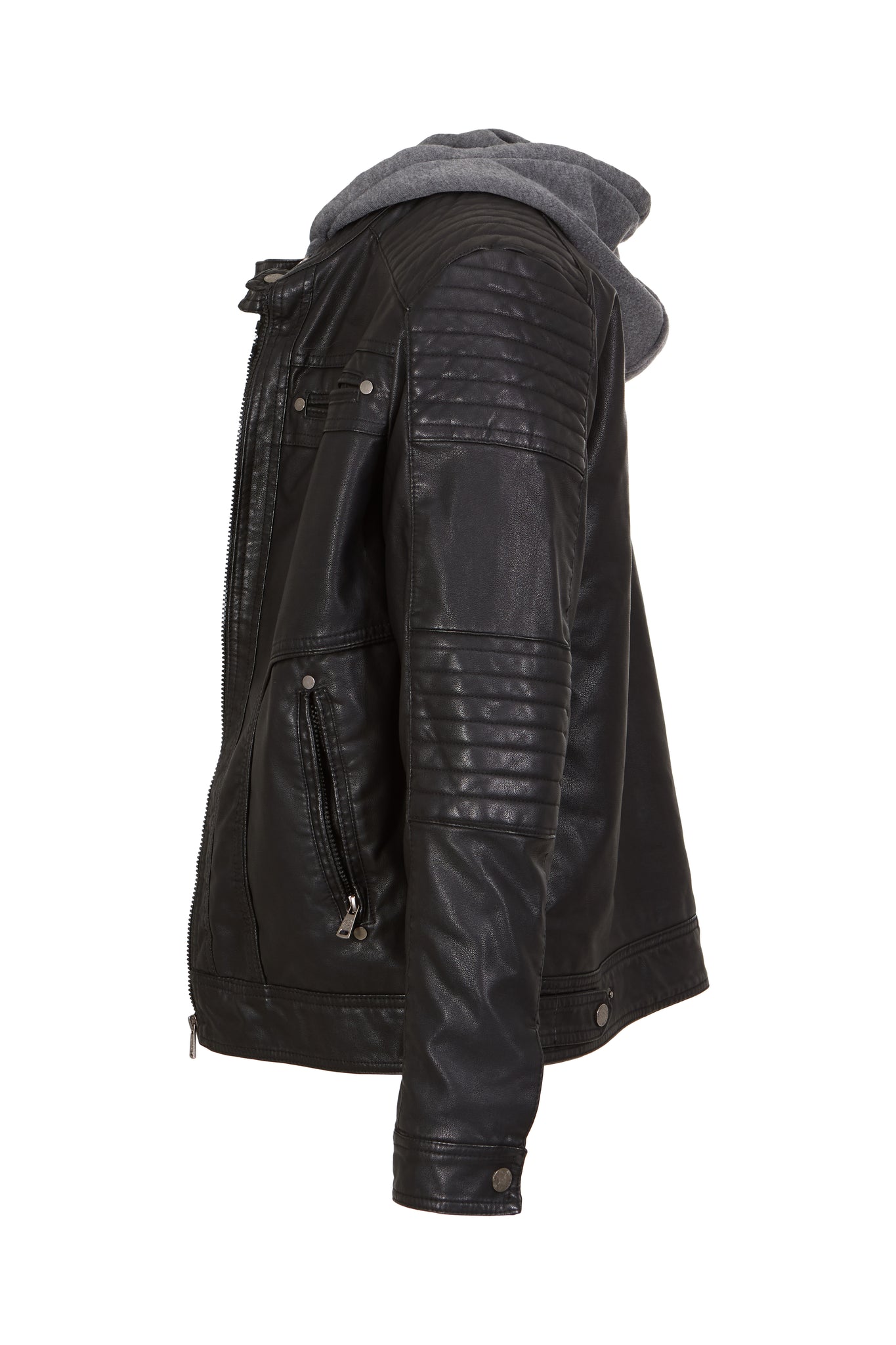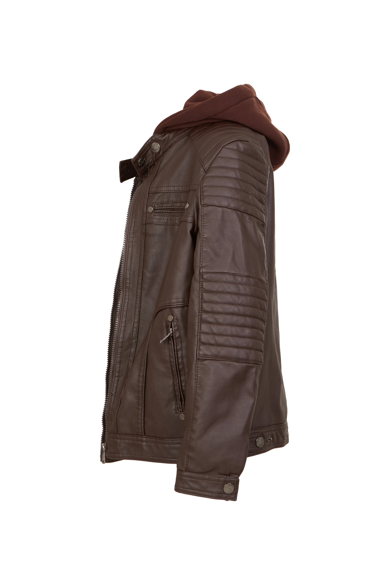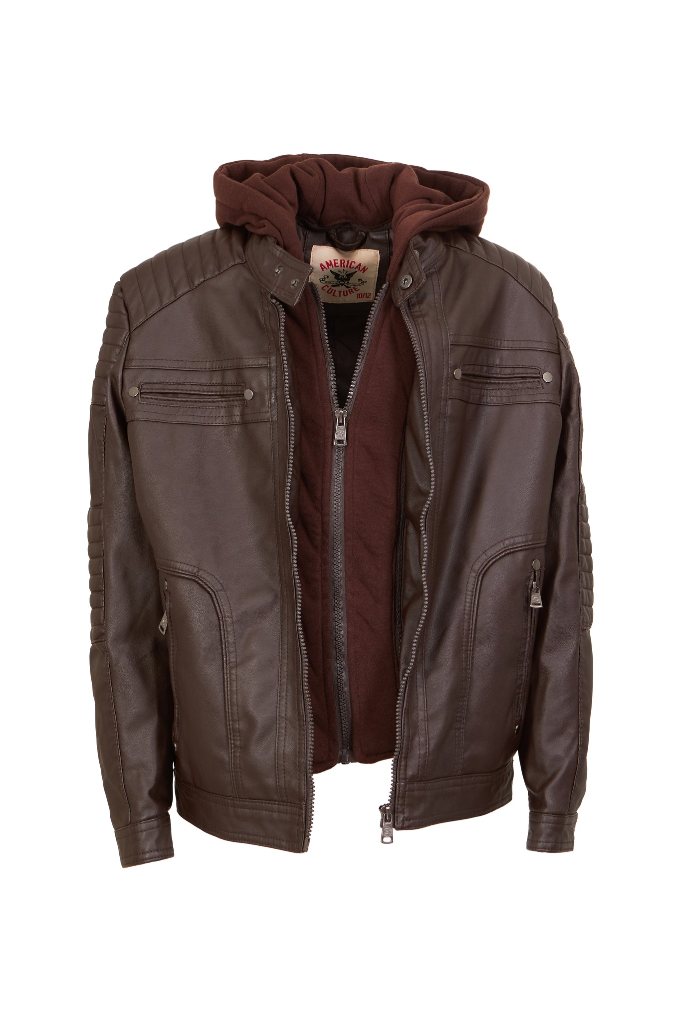 The "American Culture" Boys Hooded Leather Jacket is the perfect addition to any young man's wardrobe. Made with 100% vegan leather, it features a front zipper, four front pockets with zippers for convenience, and a quilted sleeve design that adds a touch of style. The jacket also comes with a fleece bib and hood to keep your child warm and cozy during chilly days. With its edgy design and comfortable fit, this jacket is perfect for any occasion.