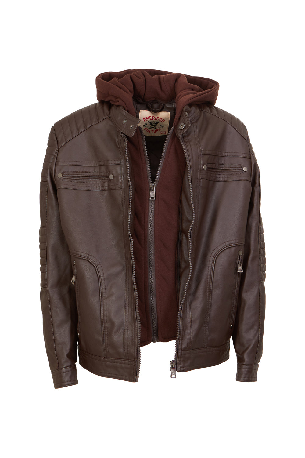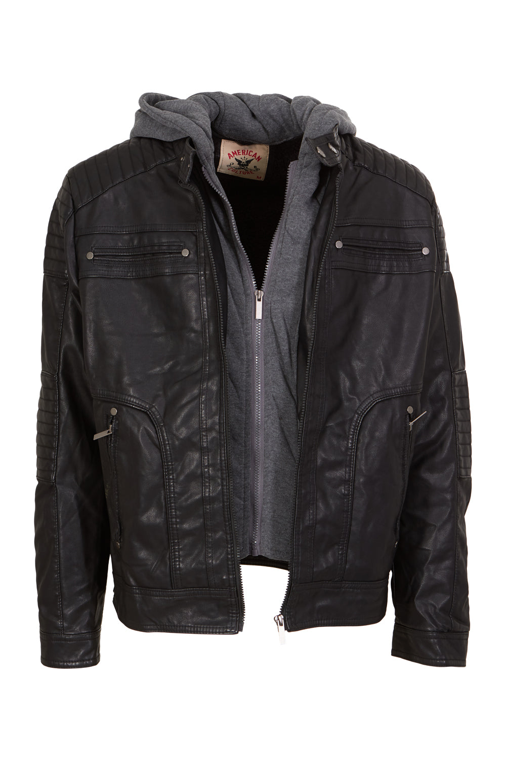 This fully loaded moto jacket from American Culture comes with faux sherpa wool lining, quilted design sleeve detailing and removable fleece zip out bib and hood.