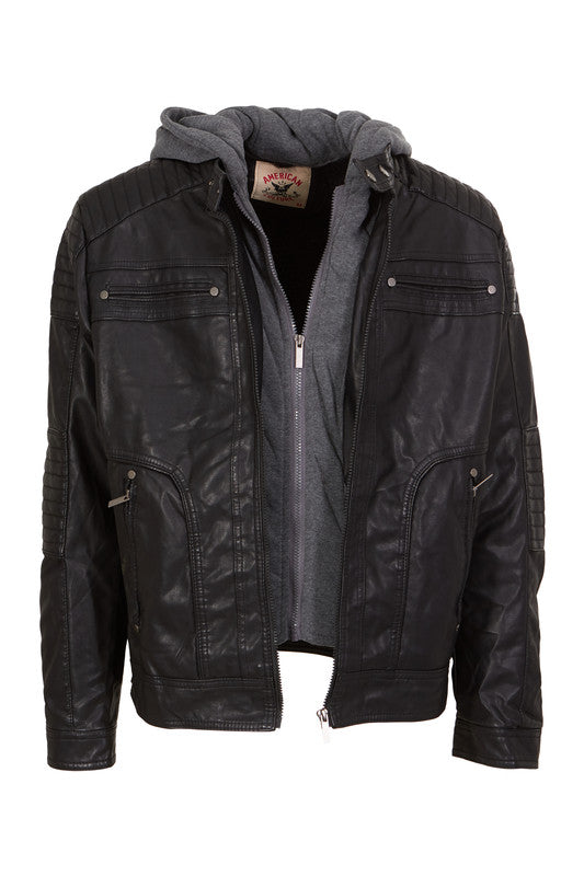 Men's Vegan Leather Updated Moto with Quilted Design Sleeve Details, Sherpa Body Lining & Zip Out Detachable Fleece Bib and Hood